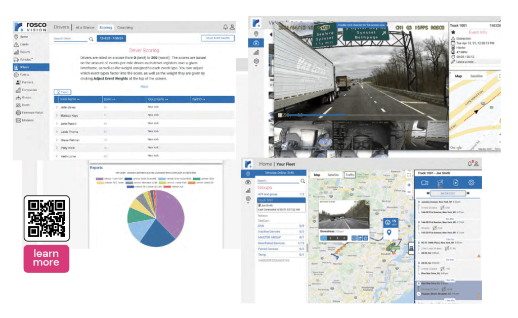 The RoscoLive® fleet manager solution fully integrates with the DV6 dash cam. See videos of incidents just minutes after they occur, thanks to the automatic upload setting. RoscoLive® works with 4G LTE – fully tested and certified by Verizon, AT&T, T-Mobile, Bell, and more. RoscoLive offers customizable datasets and reports on alerts, collisions, miles driven, speeding, fuel consumption and driver scores.